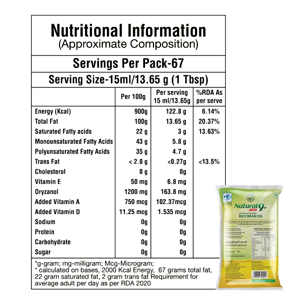 Ingredients : Physically Refined Rice Bran Oil Permitted food additives Antioxidant – Tertiary Butyl Hydroquinone (E319) Vitamin A (Retinyl Acetate) Retinyl Palmitate), Vitamin D (Ergo Calciferol)